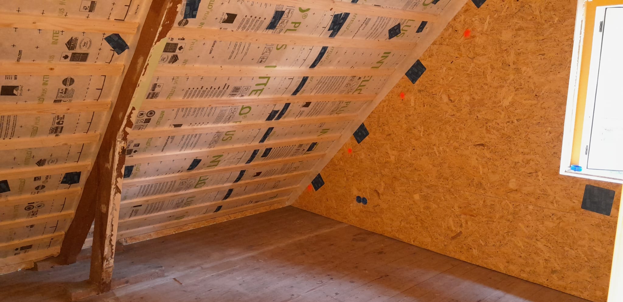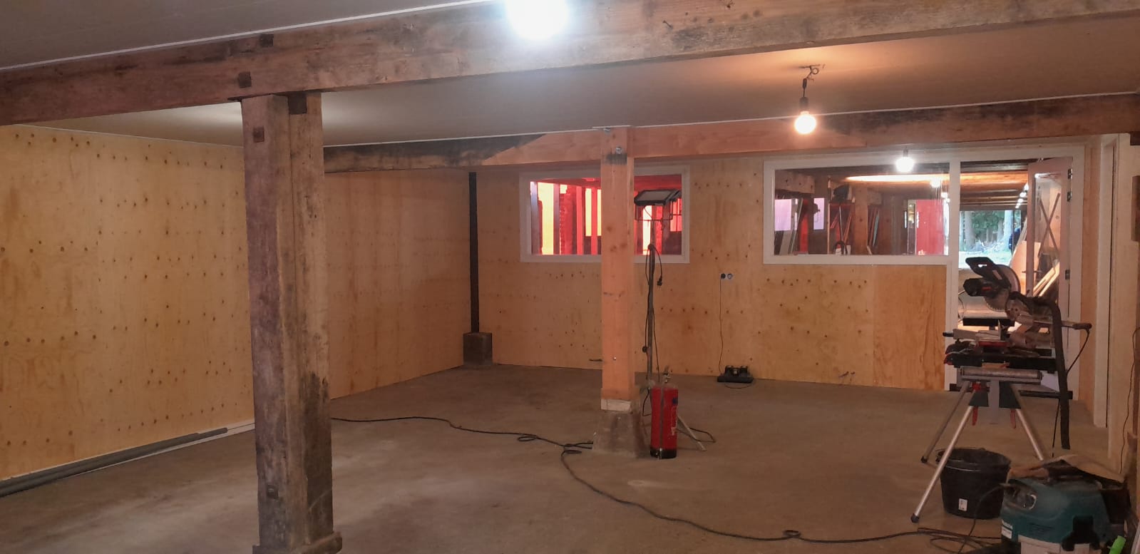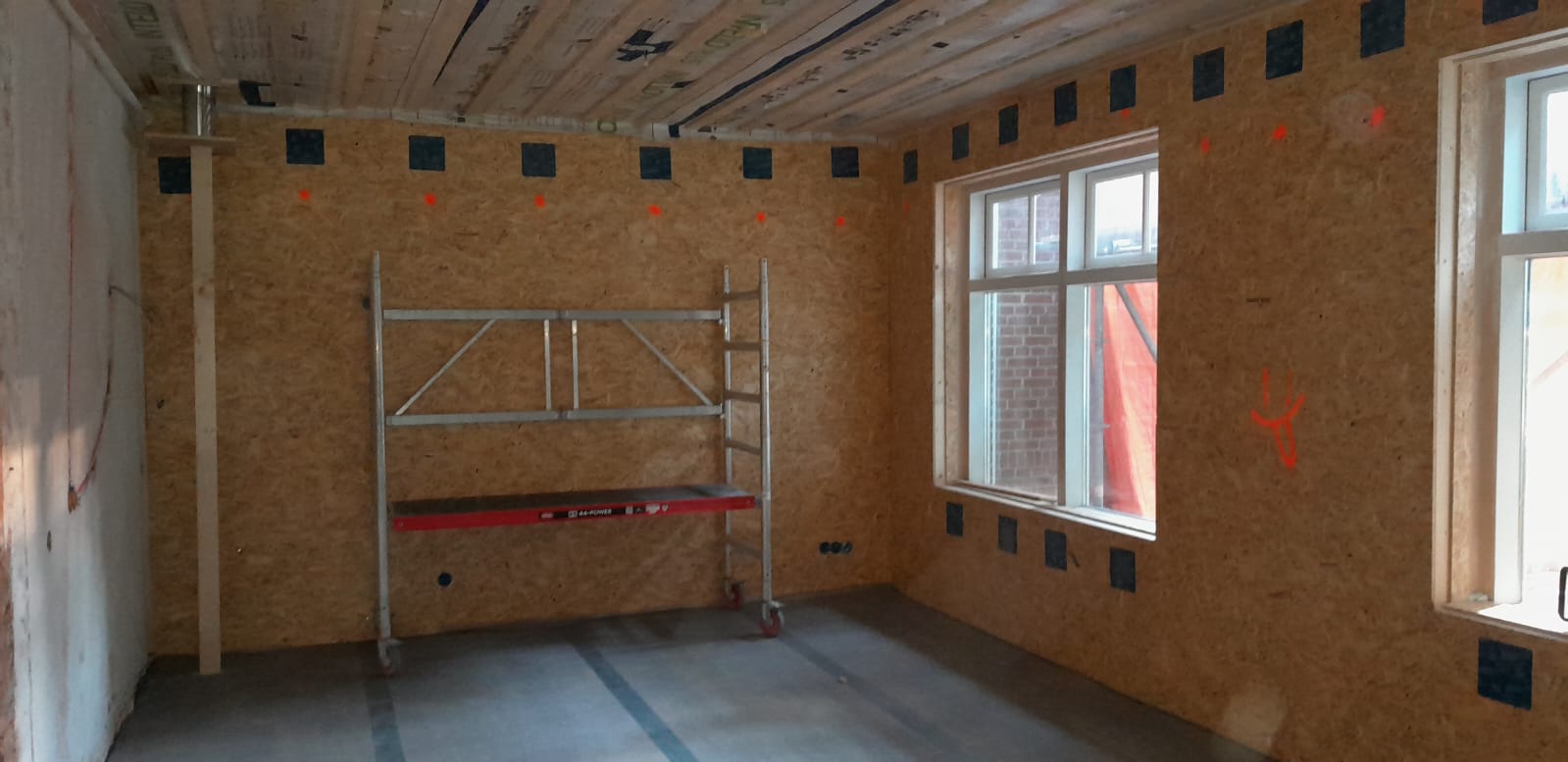 Het woonhuis is van binnen voorzien van een woonbetonvloer en vervolgens is er gestart met de voorzetwanden en de isolatie van de kap. Ook de woning is intussen volledig voorzien van een duurzame installatie en biobased isolatie. De binnenzijde van de woning bevindt zich intussen volop in de afbouwfase.