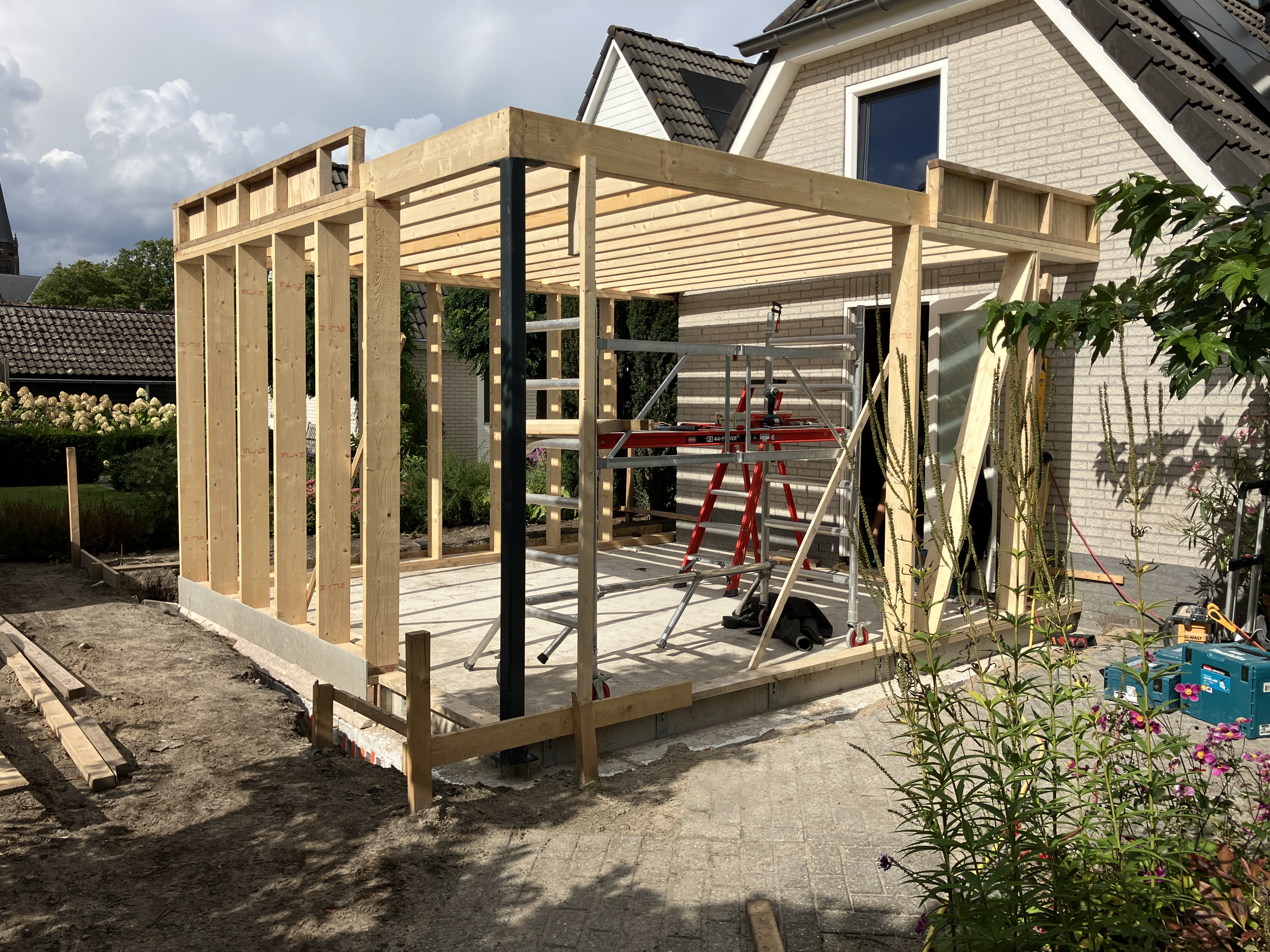 De aanbouw is opgetrokken in houtskeletbouw en aan de buitenzijde afgewerkt met Cape Cod, wat zorgt voor een moderne en eigentijdse uitstraling. In de slaapkamer is een grote pui geplaatst die zorgt voor een prettige verbinding tussen binnen en buiten. Deze pui is voorzien van ingebouwde screens. Zowel de badkamer als de slaapkamer zijn volledig afgewerkt en voorzien van moderne en duurzame installaties.